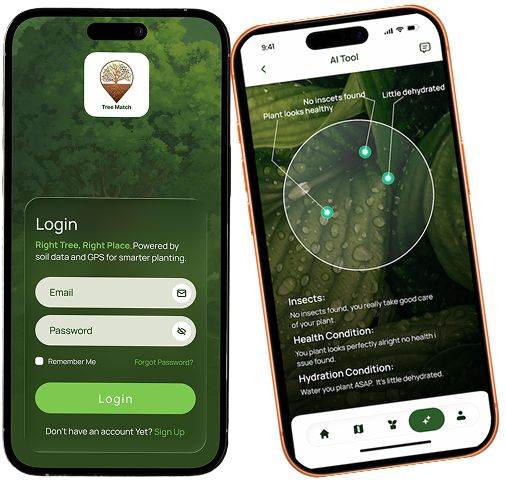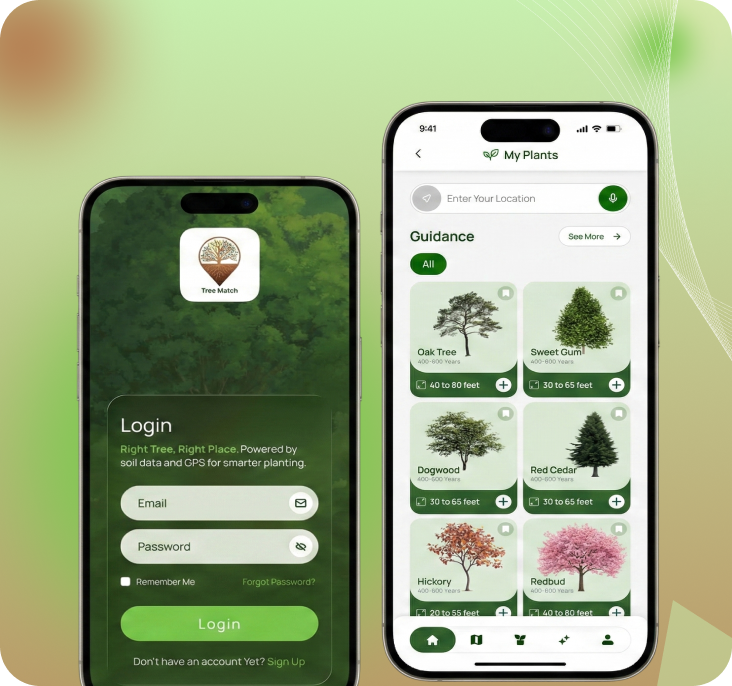 A mobile application designed to help homeowners, landowners, and farmers choose the right trees using GPS-based soil data, interactive maps, and AI-driven recommendations. It enables users to plan, manage, and monitor tree planting while providing insights on tree health and care.